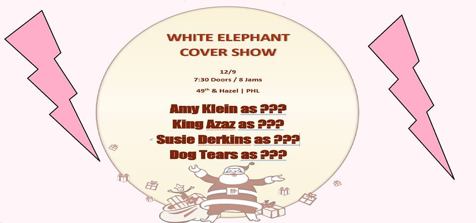 White Elephant Cover Show Amy Klein/ King Azaz/ Susie Derkins/ DT/ local bands covering each other!!! and no one knows who is covering who!!! come out for a night of suspense & holiday cheer. 🙂 7:30 doors / 8:00 music $5 if ya got it Amy Klein – https://amykleinsongs.bandcamp.com/ King Azaz – http://kingazaz.bandcamp.com/ Susie Derkins – https://susiederkins.bandcamp.com/ Dog Tears – http://dogtears.bandcamp.com/